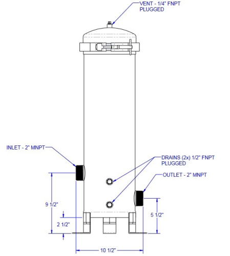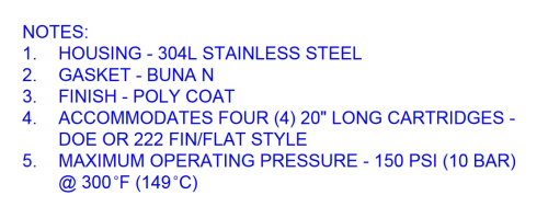 - QFP4X2-304 - Described as CARTRIDGE HOUSING 4X20" 304SS CLAMP LEGS 2" MNPT, 40 GPM, 150 PSI, 250°F